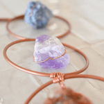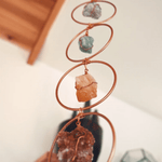 Besonderheiten: 7 rohe Natursteine (4–6 cm), handgewickelt mit Kupferdraht und in 8-cm-Metallringen eingefasst.
